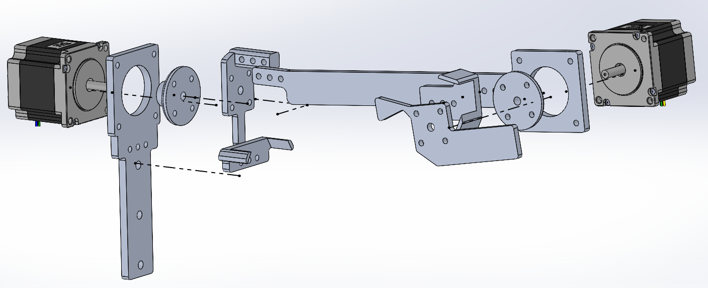 Motion analysis was performed in SolidWorks over the one-second cycle it takes for each function to complete its full range of motion, finding a required torque of 2.5-pound-force-inch (40-oz-in) for the shoulder and 0.078-pound-force-inch (1.25 oz-in) for the elbow. Utilizing a 200% safety factor to account for costuming, shells, and safety, we chose the NEMA 23 5704M-10 with a holding torque of 140 oz-in for the shoulder and the NEMA 23 5704X-02 with a holding torque of 75 oz-in for the elbow. Additional safety factors were given to the elbow due to uncertainty over the final required torque for that function, as the mechanism, and thus the calculation features a minimal piece of aluminum as an attachment point, leaving much of what will require greater torque to shells and costuming.